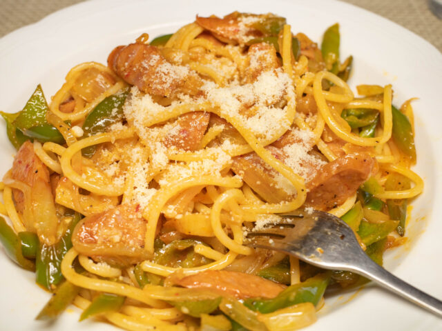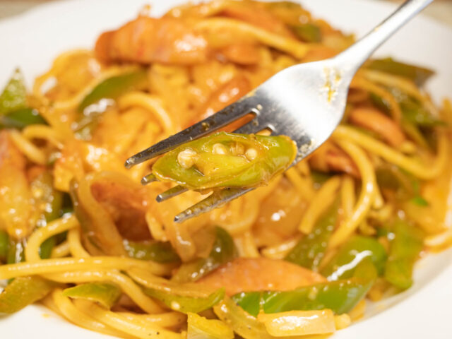 辛いソーセージのチョリソと青唐辛子のホットナポリタン