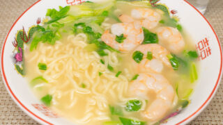 むきエビとセロリを具材にしたラーメンをつくりました。袋麺の「明星チャルメラちゃん ...