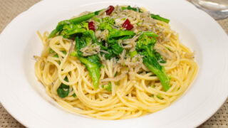 ちりめんじゃこの旨みをたっぷり含んだペペロンチーノのオイルに、ほろ苦い菜の花がとても良くあいます。